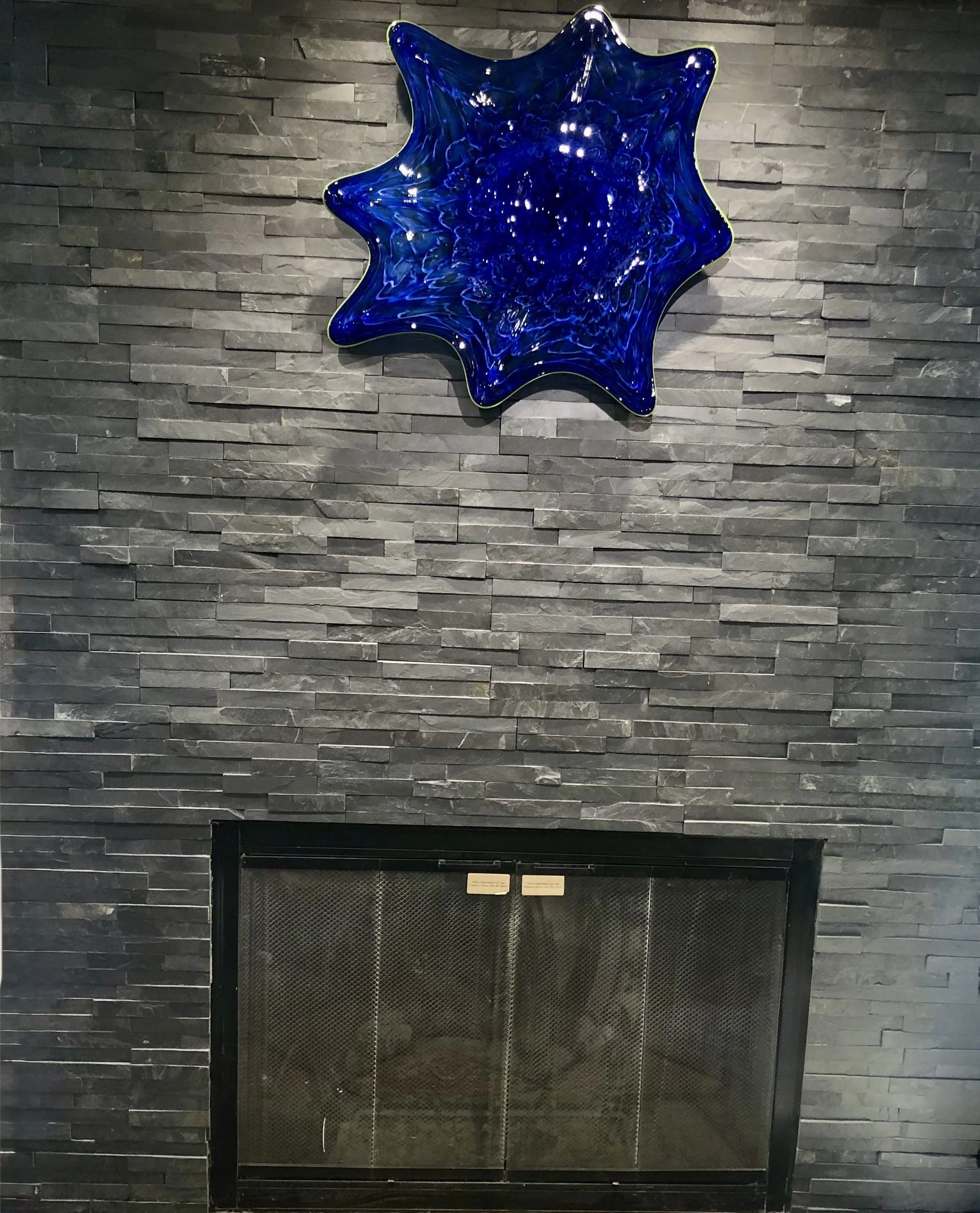 This modern fireplace combines bold texture and refined design. Hand-laid black slate stone creates a sleek, dimensional surface that highlights the brilliant blue glass centerpiece above. Every detail was crafted with precision to achieve a clean, balanced look that transforms the space into a true focal point.